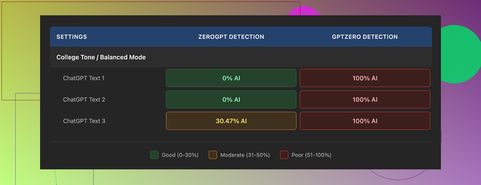 • GPTZero flagged every single “humanized” output as 100% AI. No borderline scores, no partial passes.