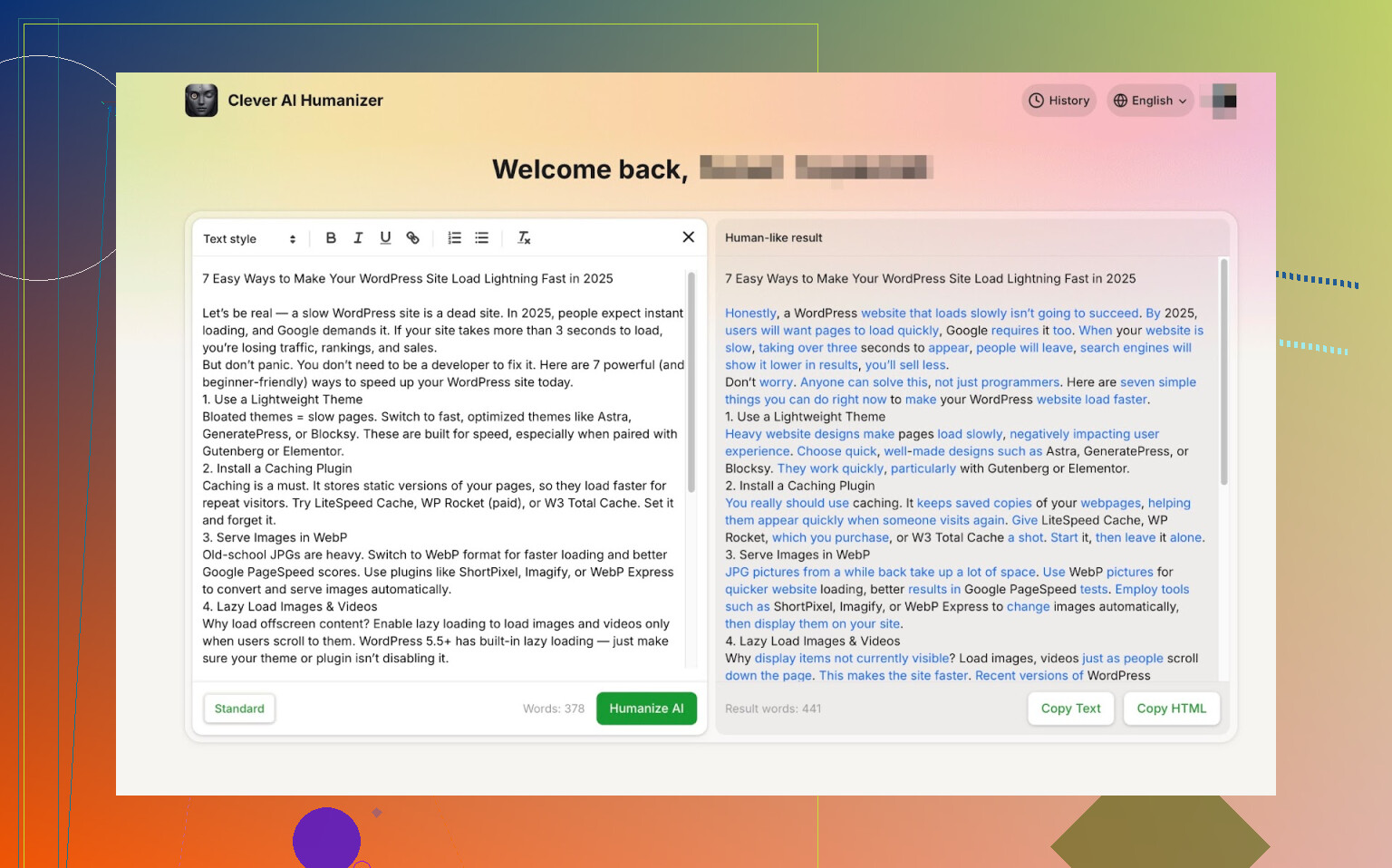 The speed’s almost suspicious — I pasted in a chunk of text, and before I could finish sipping my coffee, it spat something right back out. Multilingual too, if you’re into that. Caveats though: it sometimes murders commas and dumbs down certain expressions. Some sentences get the corporate-washed treatment and come out sounding a little bland. Still, for something you pay zero bucks for, it’s impressive.