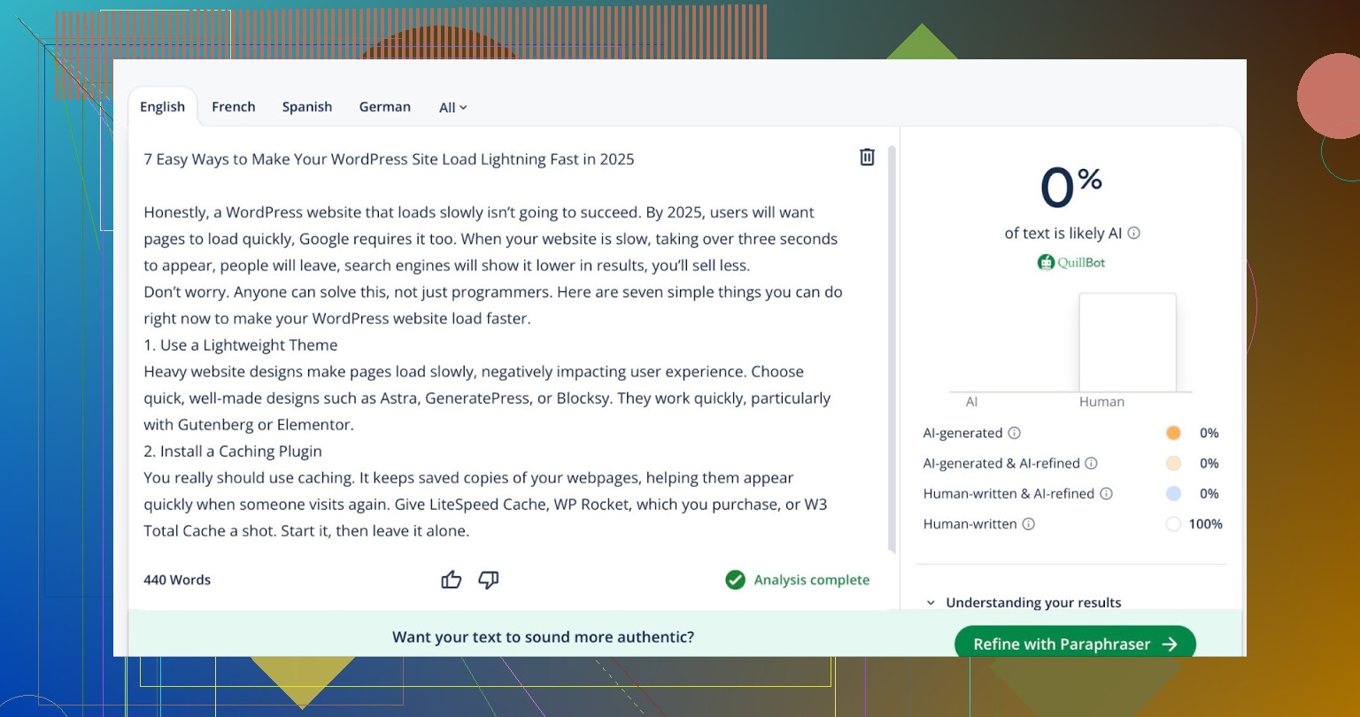 Because why stop there? Quillbot AI Content Detector ran circles around the initial text but barely batted an eyelash at the humanized paragraph.
