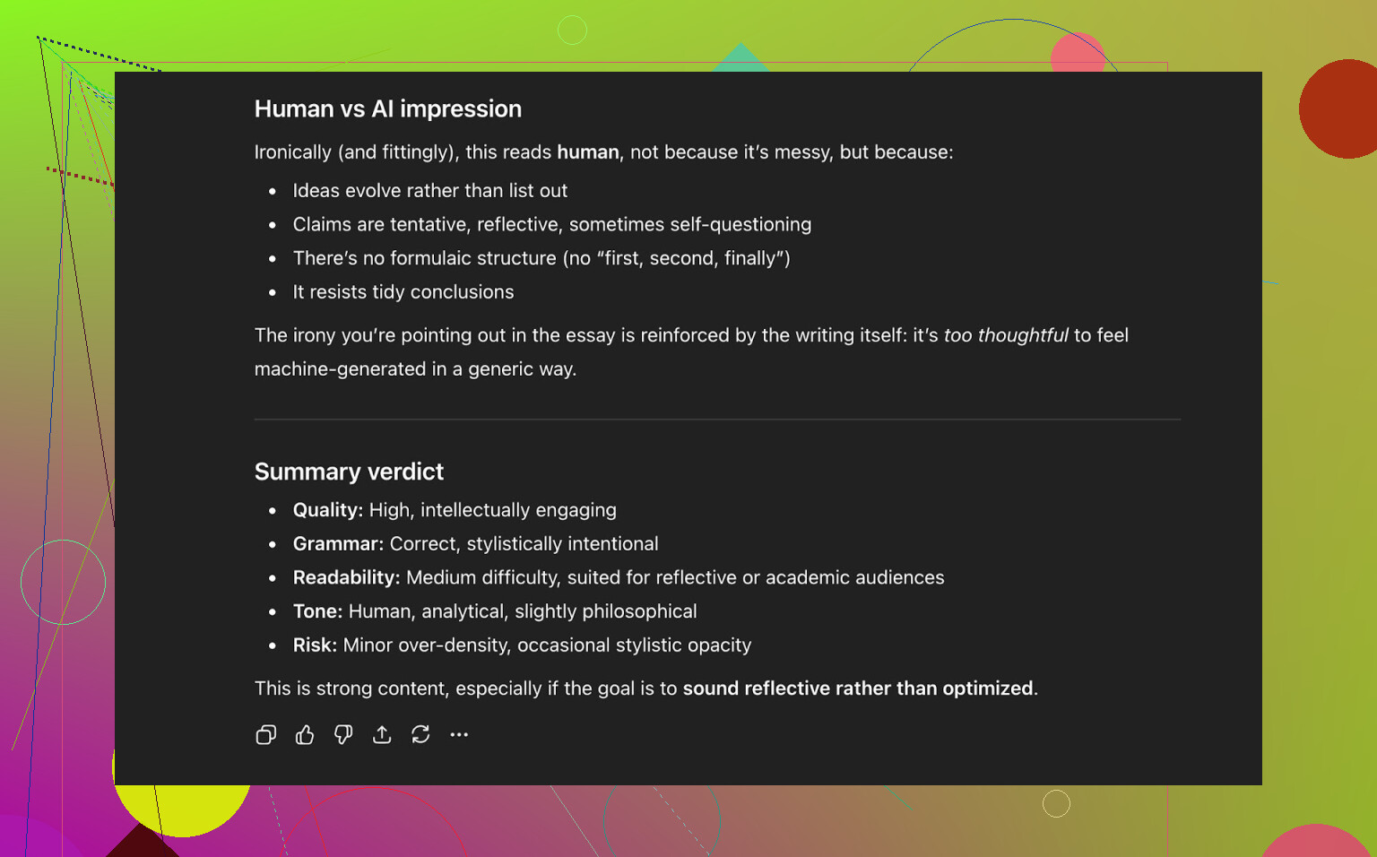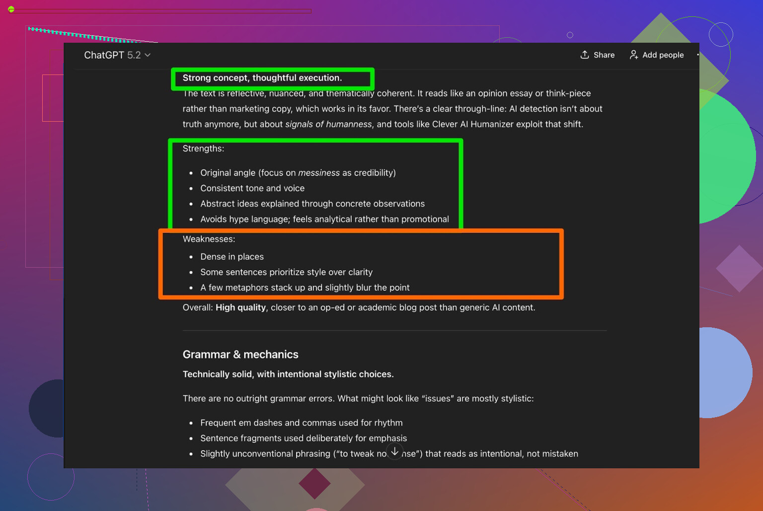 Así que volví a pasar el texto humanizado por ChatGPT 5.2 y le pedí que lo evaluara.