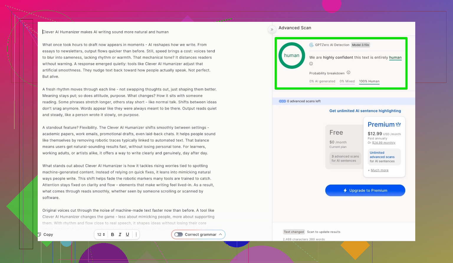 - Clever AI Humanizer es inusualmente potente para ser una herramienta gratuita a la hora de eliminar el evidente aire a IA y bajar las puntuaciones en detectores.
