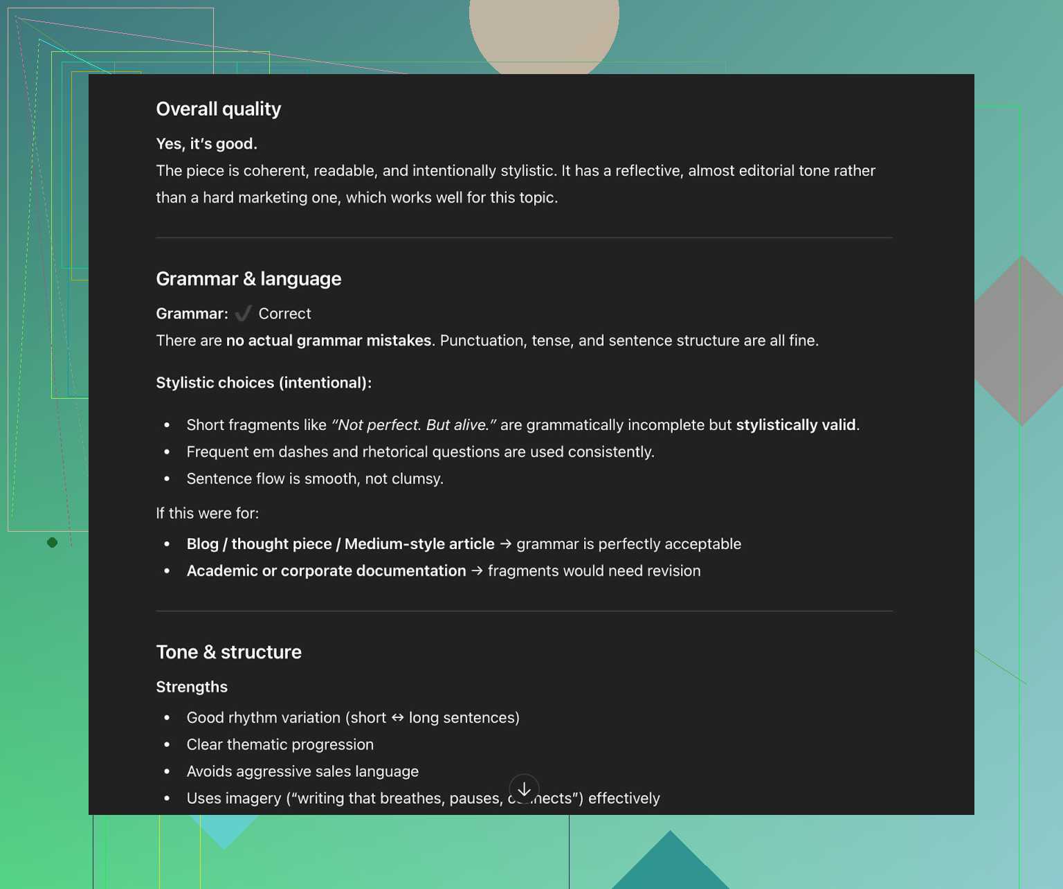 - La estructura macro sigue sintiéndose muy de LLM: subtítulos prolijos, párrafos equilibrados, progresión súper “ordenada”.